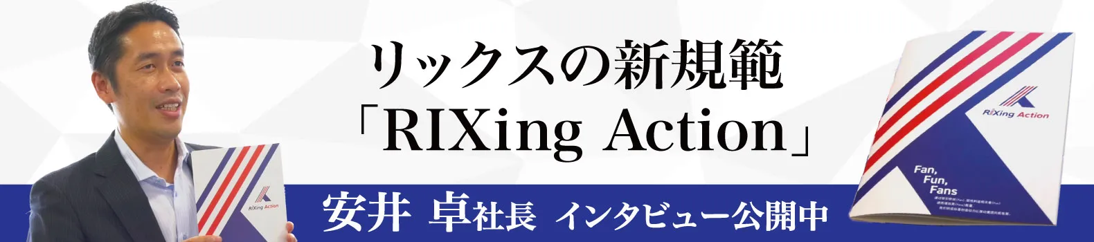 堅実に積み重ねてきた歴史と信頼のもと、日本にとどまらず、世界にも視野を広げ、事業拡大を叶えてきた当社。グローバルな組織展開に伴い社員数も増加を続ける中、今後のさらなる成長を実現するために、同じビジョン・想いの共有に向けたRIXing Actionを策定しました。全社一体となってRIXing Actionを実践していくことで、多くのファン(Fan)をつくり、ファンの皆さまに喜んでいただける(Fun)環境の構築が、新たなファンの獲得(Many Fans)、そして、さらなる大きな追い風(Many Fan)につながり、好循環が生まれる。100年を越えて受け継がれてきたDNAと、時代に合わせた仕事との向き合い方を融合させ、会社全体のレベルアップを目指して。社員一人ひとりと共に歩み、より良い組織、次の100年を育んでいきたいと思っています。