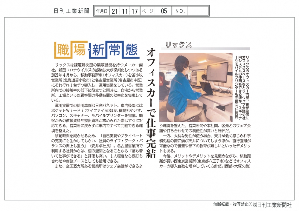 日刊工業新聞(2021年11月17日付 5面)に、当社が今年度より実証試験を始めた「オフィスカー利用」について記事を掲載頂きました。