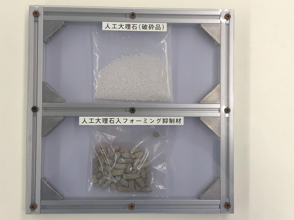 新製品ロッキーライトRSは、従来の持続性、形状保持に優れた製紙スラッジに加え、これもまた廃棄物として主に埋め立て処分されていた人工大理石製品の端材、廃材、加工屑をある粒度範囲の細粒にし、製紙スラッジと適切な比率で組み合わせることにより初期性能を上げ、少ない量でもフォーミング鎮静効果を得ることを可能とした環境配慮型製品です。