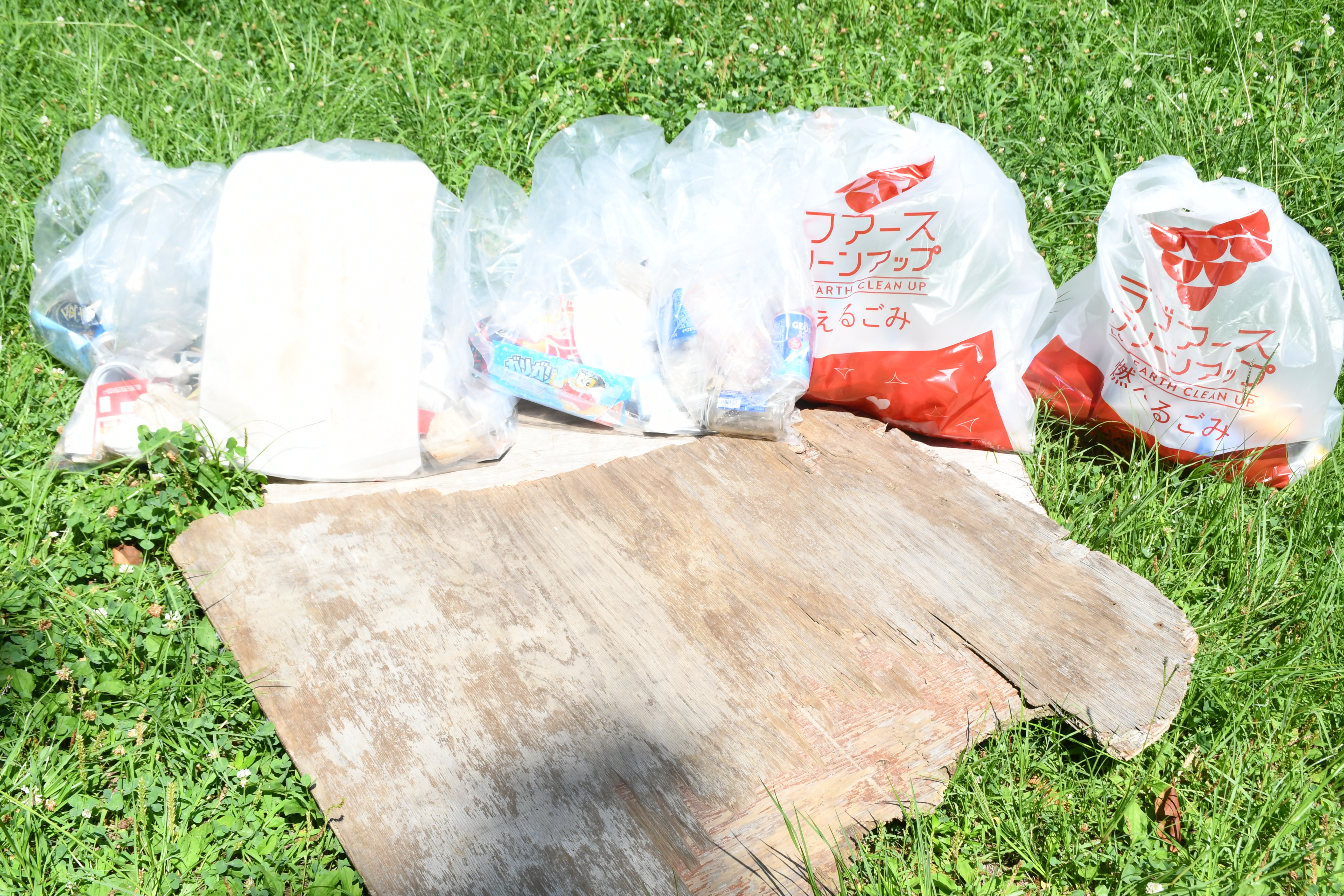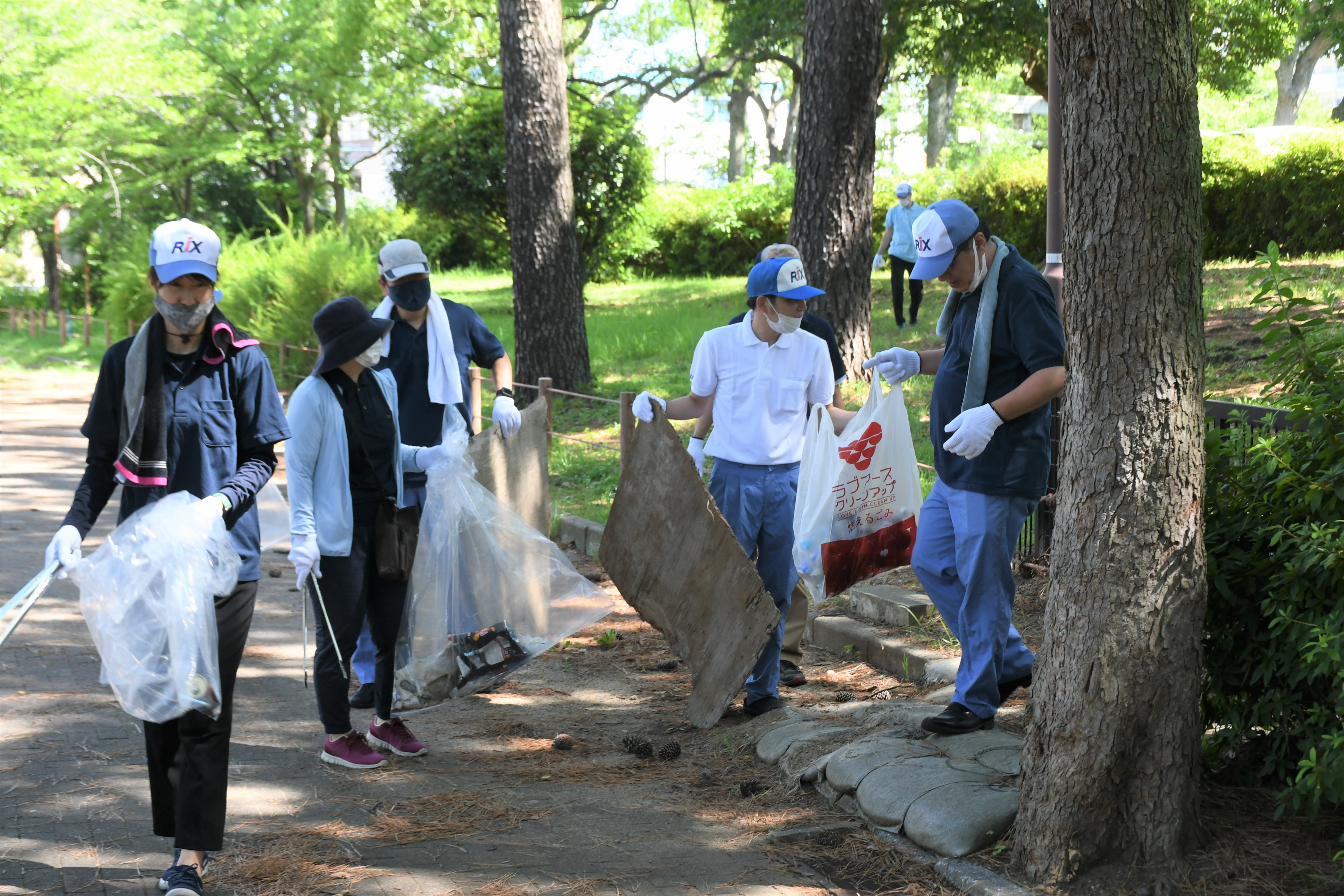 当日は、当社従業員14人が参加し、約1時間かけて園内に落ちていた空き缶やたばこの吸い殻、プラスチックごみ、板などを拾いました。