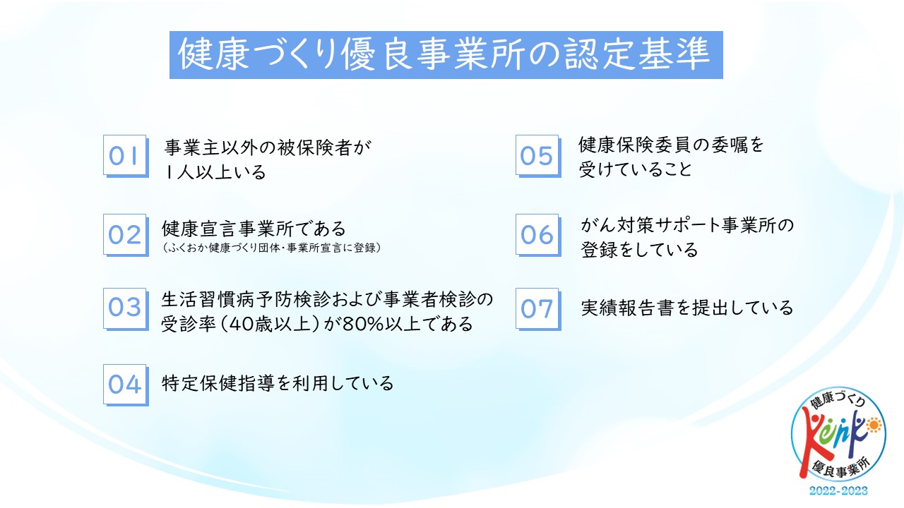 当社はこの度、全国健康保険協会(福岡支部)の取り組みである「健康づくり優良事業所」の認定企業となりました。従業員の健康維持や促進に努めた企業を全国健康保険協会(各県支部)が認定するもので、下図で示した7項目が認定基準です。