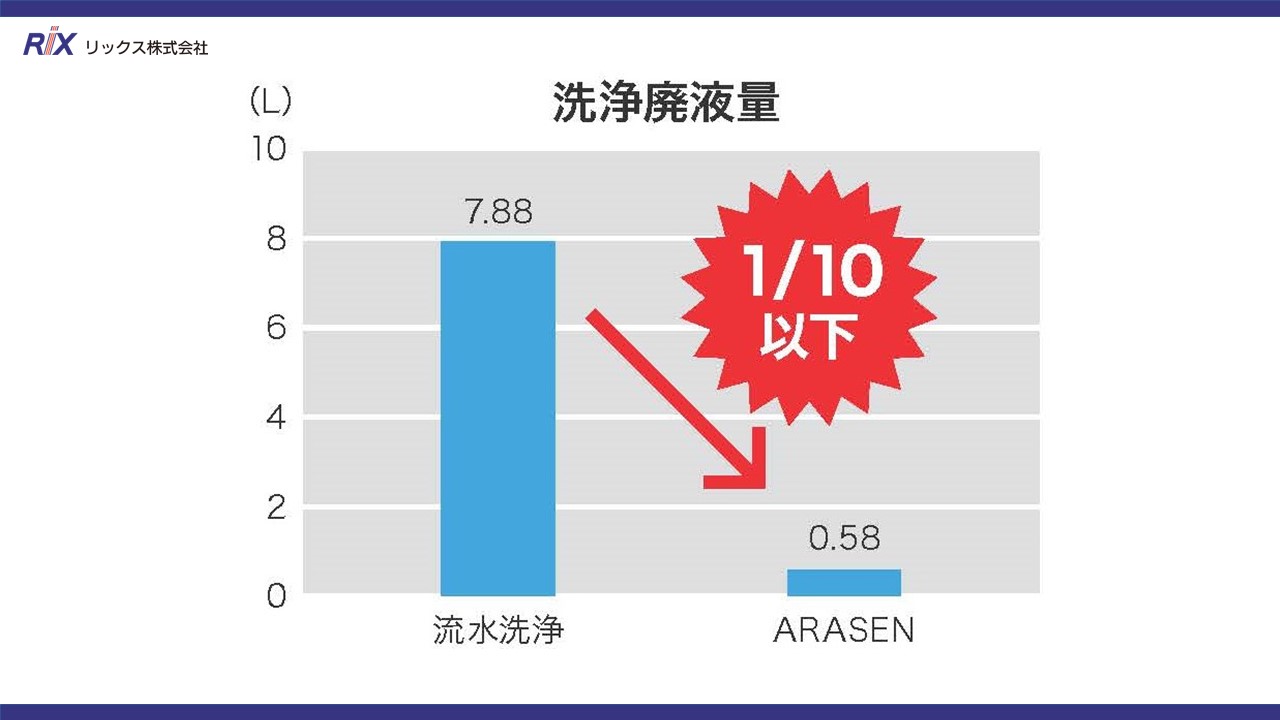 廃液低減による環境負荷の低減や、作業者・コストの負担を減らすことを⽬標に、「洗浄」「流体」の技術に知⾒を持つ当社が開発したのがARASENです。洗浄に使⽤する液をいかに少なくできるか試験を繰り返し、約4年を経て開発した独⾃のエアー圧送⽅式により、上記課題をクリアする製品となっています。![]()