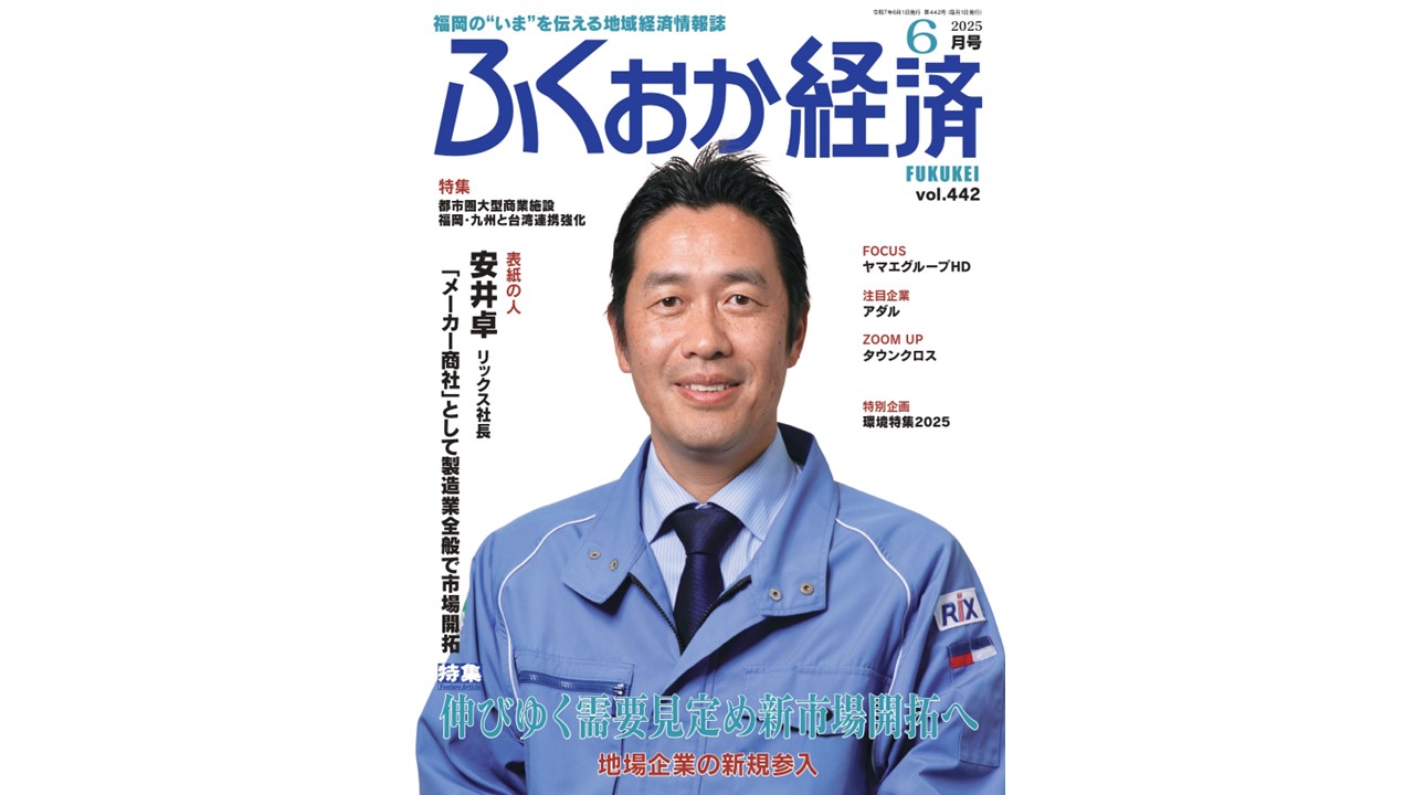 月刊誌「ふくおか経済 2025年6月号」にて当社を表紙・記事で掲載いただきました。 2025/06/02 メディア掲載 月刊誌「ふくおか経済 2025年6月号」にて、表紙と記事で当社を掲載いただきました。代表取締役社長執行役員の安井卓より、直近の取組みや今後のビジョンについてご紹介しております。ぜひご覧いただけますと幸いです。▶記事はこちら 新着情報一覧へ戻る