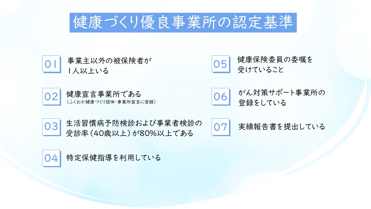 当社はこの度、全国健康保険協会(福岡支部)の取り組みである「令和7年度 健康づくり優良事業所 ゴールド」の認定企業となりました。従業員の健康維持や促進に努めた企業を全国健康保険協会(各県支部)が認定するもので、下図で示した7項目が認定基準です。