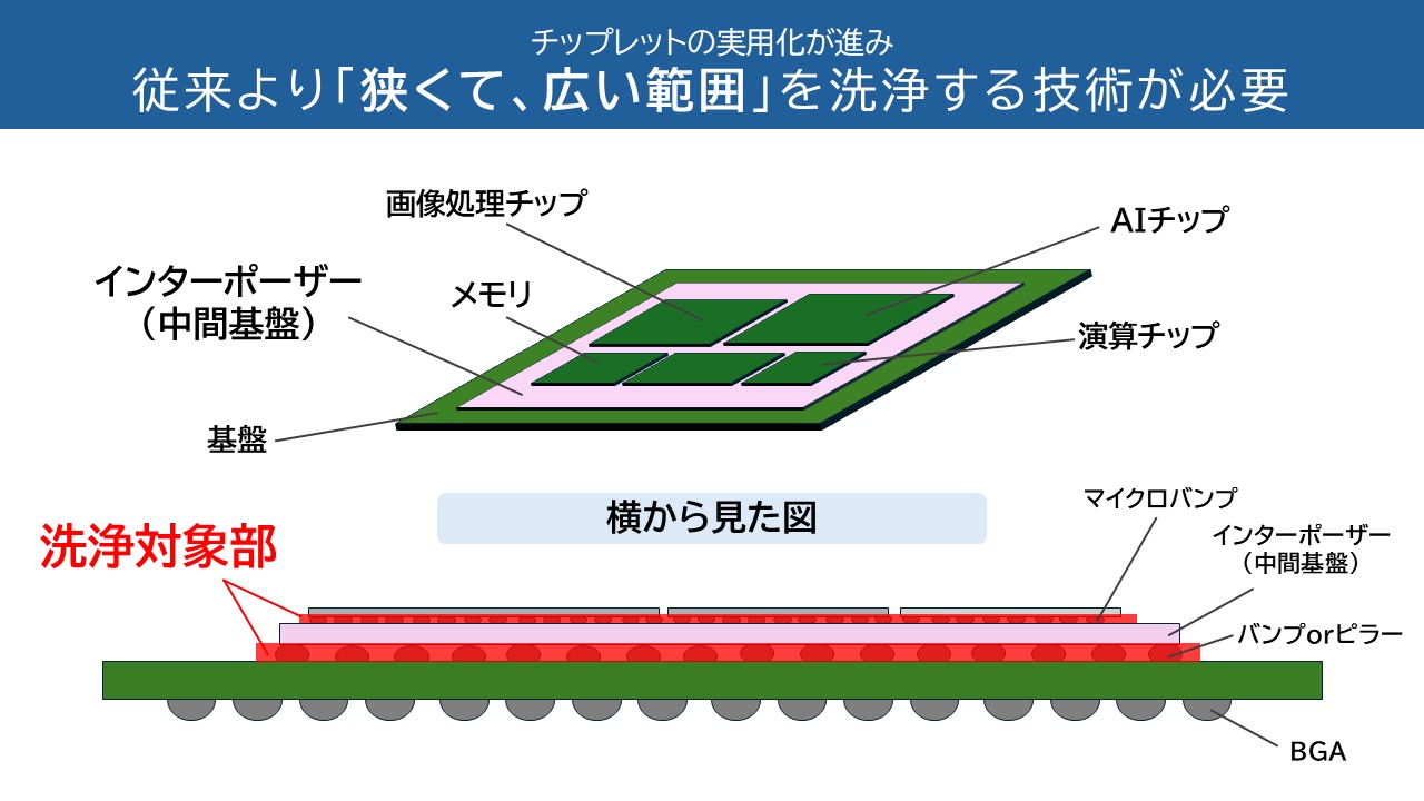 この新技術により、近年の2.5次元実装技術において進歩している有機インタポーザーなどの大判化実装品の狭い隙間に残っているフラックスも効果的に洗浄することができ、次世代半導体の生産性向上に貢献します。