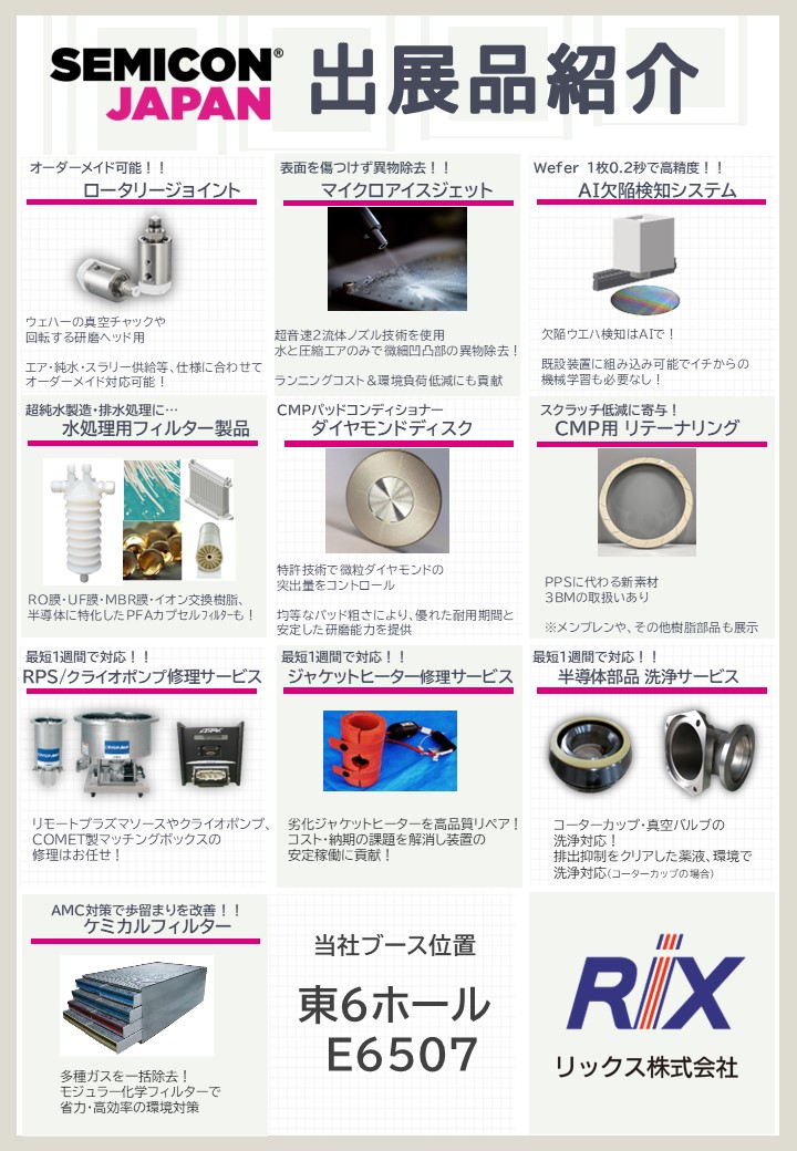 当社は、2025年12月17~19日に開催される「SEMICON Japan 2025」にブース出展します。同展示会は、半導体産業における製造技術、装置、材料をはじめ、車やIoT機器などのSMARTアプリケーションまでをカバーした、エレクトロニクス製造の国際展示会です。当社ブースでは下記の製品・サービスを展示予定です。ぜひお立ち寄りください。
