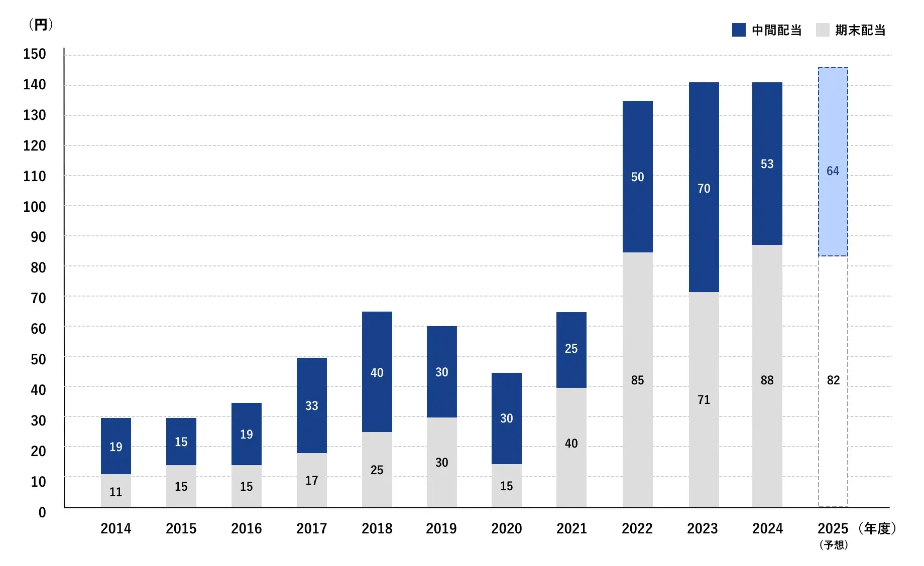 | 中間配当(円) | 11 | 15 | 15 | 17 | 25 | 30 | 15 | 25 | 50 | 70 | 53 | 64 |