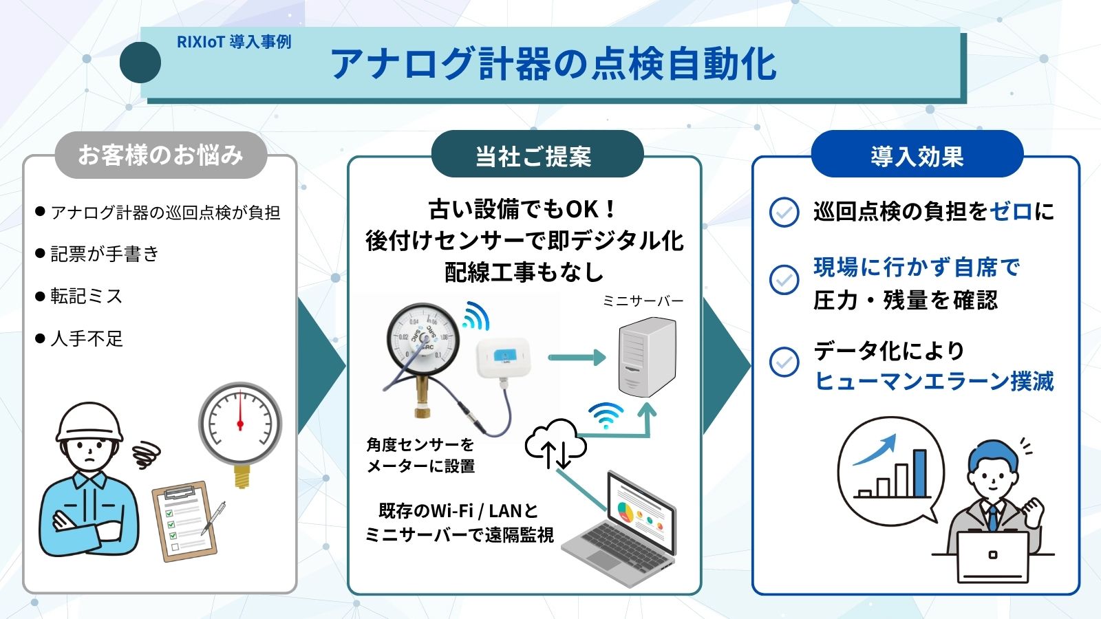 配線工事レス!後付けセンサーで即デジタル化。 角度センサーをメーターに設置し、既存のWi-Fi/LANとミニサーバー「RIXIoTmini 」(ArmadilloG3)で遠隔監視。
