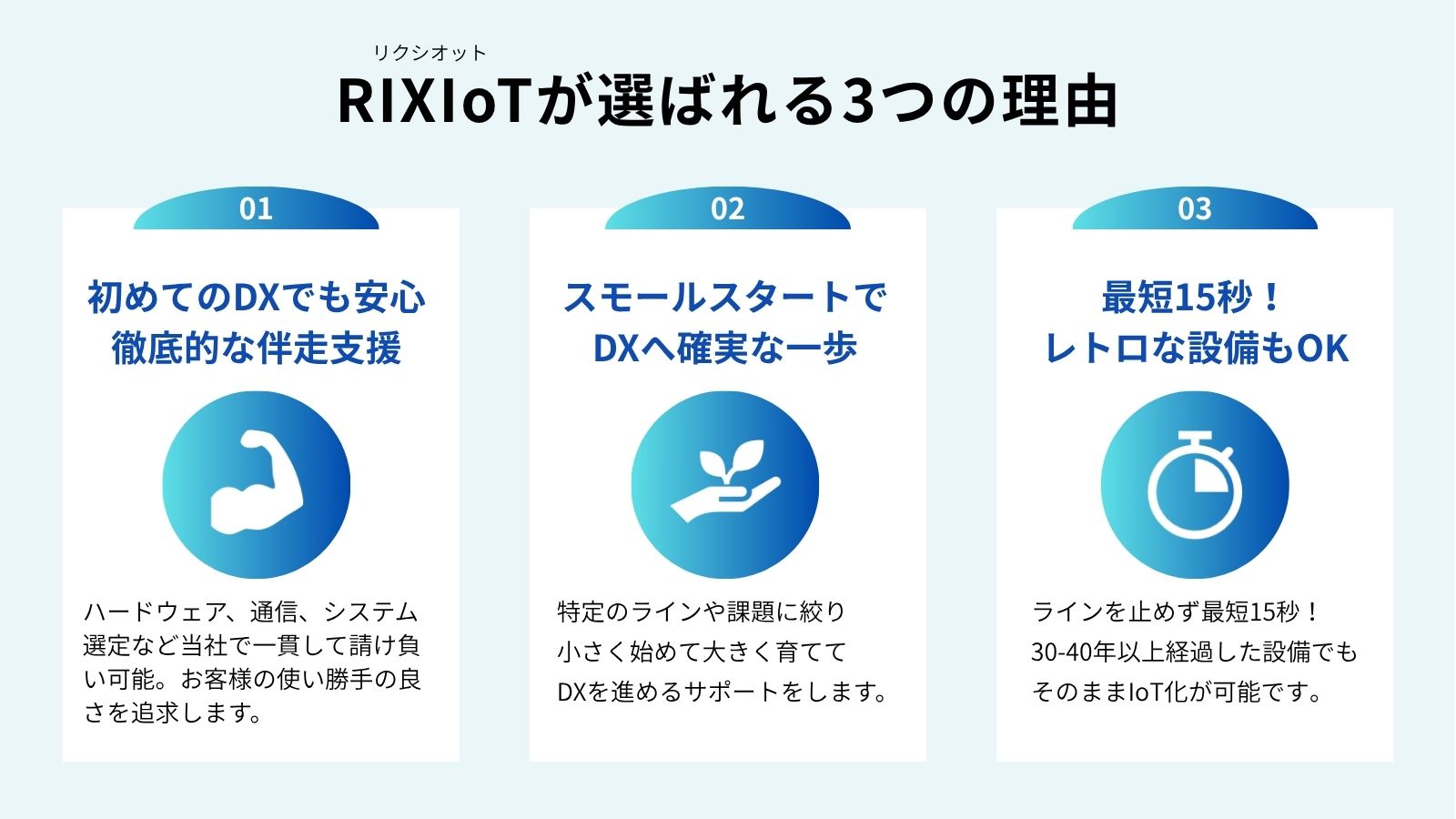 「古い設備だから」「専門人材がいないから」と諦めていませんか?RIXIoTは、現場に最適化された伴走型のDXソリューションです。