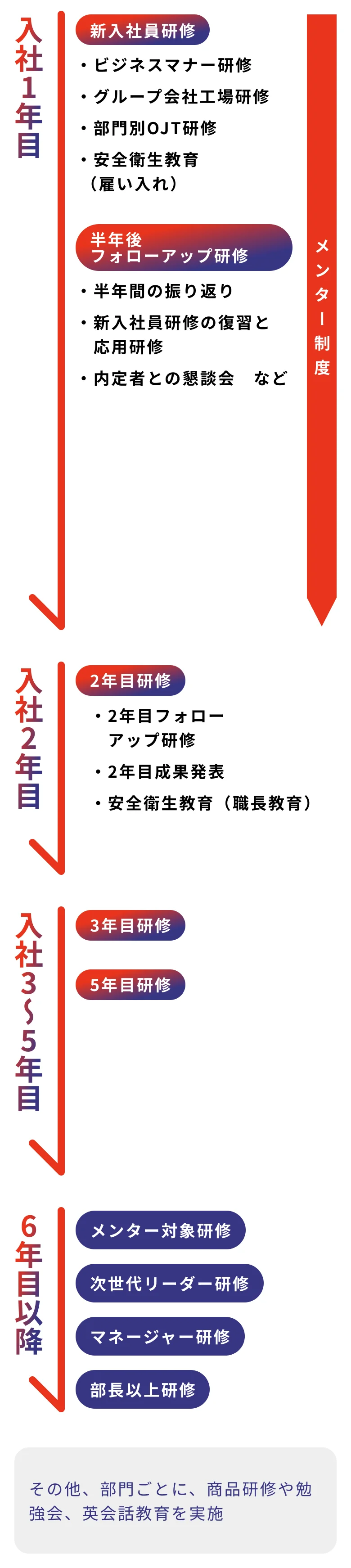 新入社員配属後~約1年半、新入社員(メンティ)の育成を直属の先輩社員(メンター)がサポートする制度です。